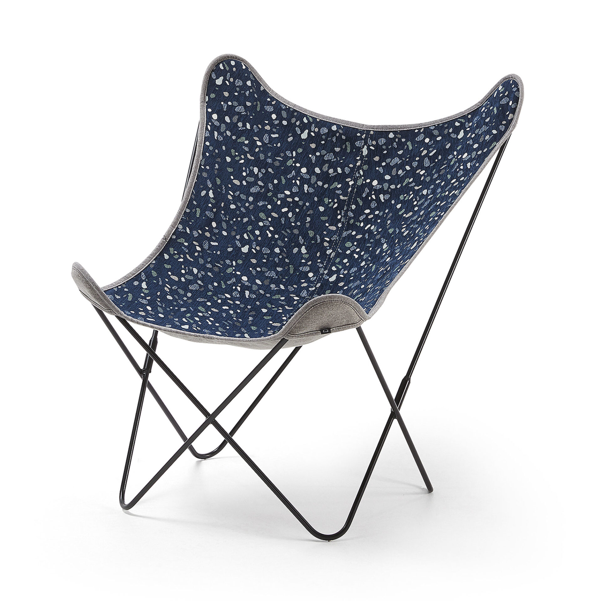 Silla Butterfly con estructura de acero color negro y asiento en tela.