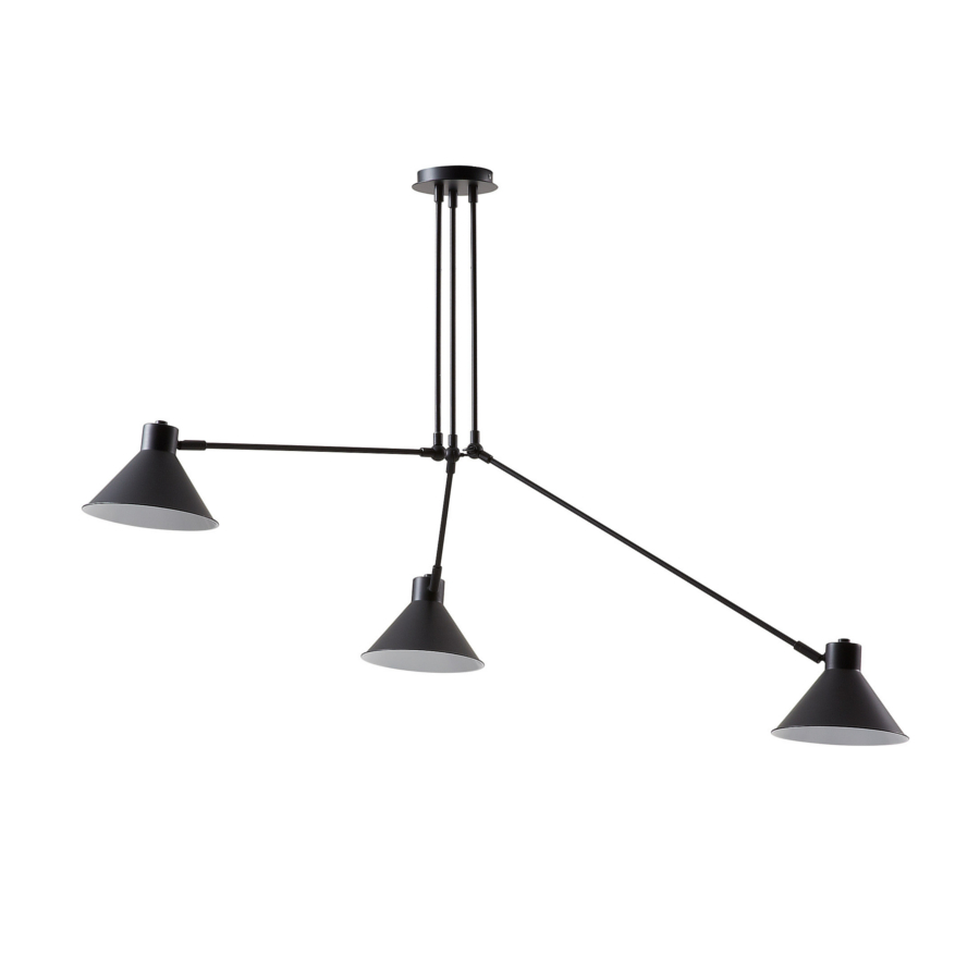 Lámpara Dione Negra. Lámpara de techo de metal con 3 brazos articulados. Pantallas metálicas.