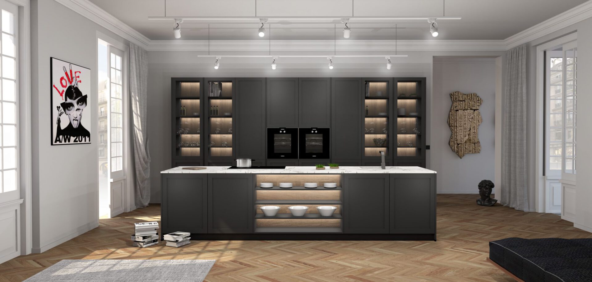 Publicado el 28/02/2020 a 1920 × 914 en Cocina Manhattan Antracita con Isla en Paralelo.
